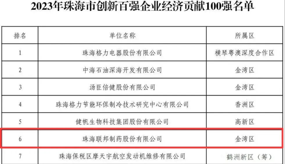 聯邦製藥珠海公司入選「2023年珠海市創新百強企業」名單