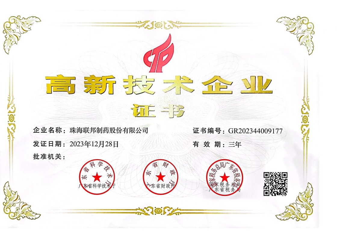 聯邦製藥珠海公司(含中山分公司)連續六次通過「高新技術企業」認定
