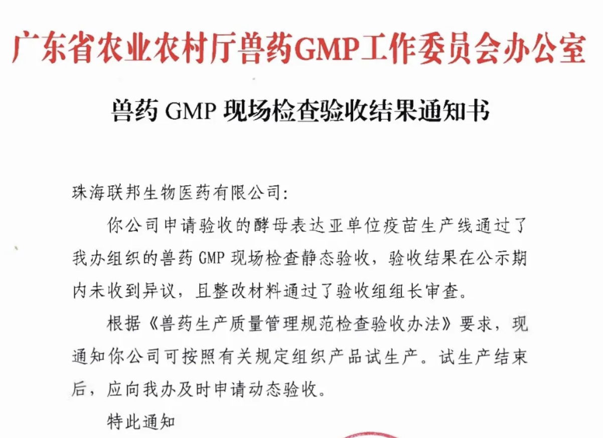 聯邦生物公司獸用生物製品生產線通過獸藥GMP靜態驗收