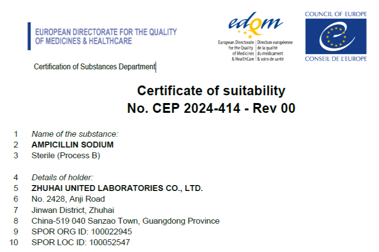 聯邦製藥氨苄西林鈉無菌原料藥喜獲CEP證書