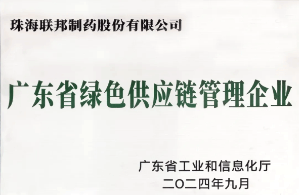 聯邦製藥珠海公司榮獲廣東省綠色供應鏈管理企業稱號