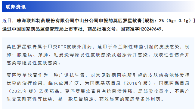 聯邦製藥莫匹羅星軟膏獲批上市