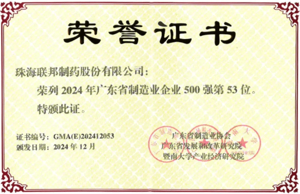 聯邦製藥珠海公司入選「2024年廣東省製造業企業500強」